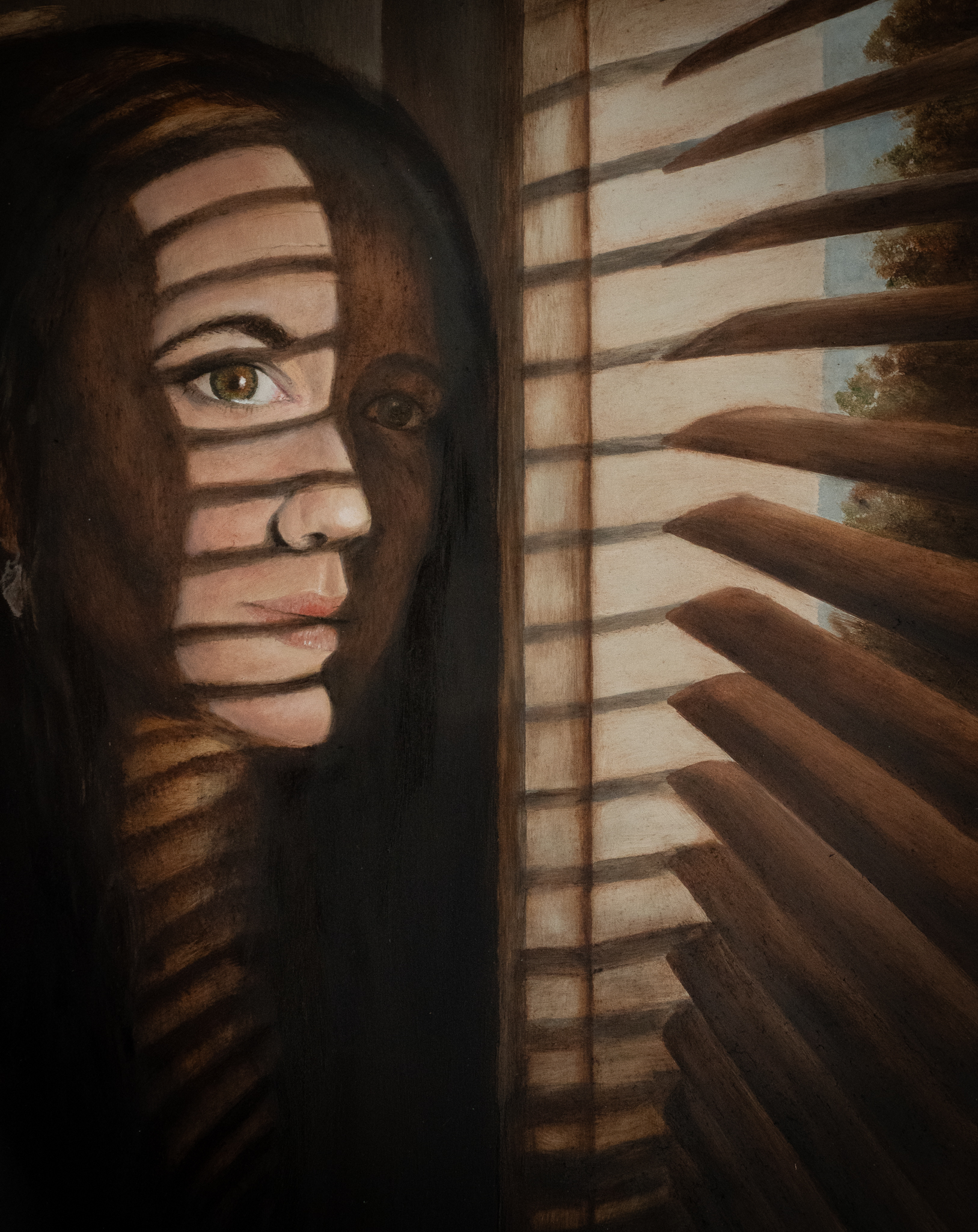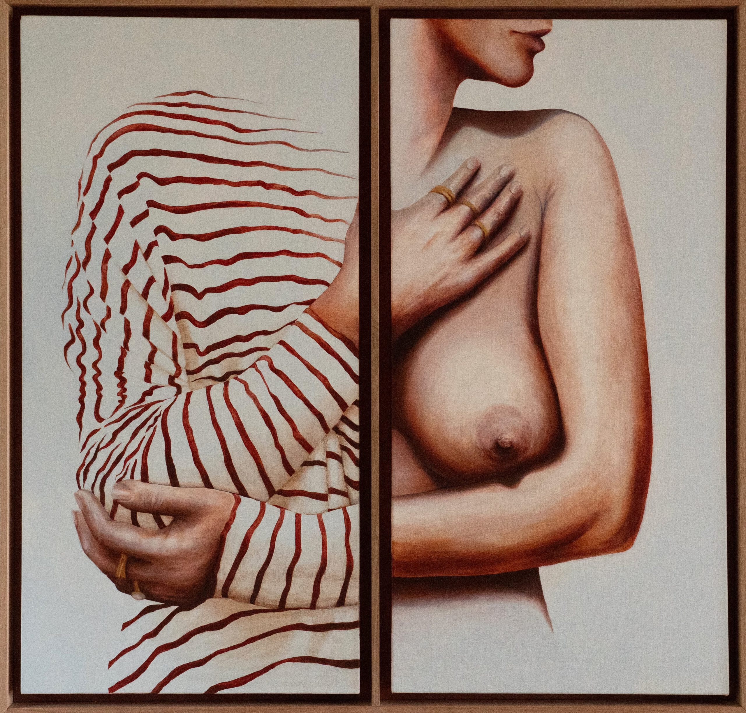 Last year, was a year full of deeper connection to myself. The journey to fully dedicate myself to art has been long and not so easy. Since I moved to Australia, disconnected from my roots, I finally can say I’ve found my path. It has left me both vulnerable and free. My self-portrait ‘Between the Lines’ is a reflection of this transformation. I wear a striped shirt, like the once my mother always wore. As eldest daughter, I grew up feeling surrounded by expectations from others, whether they were truly there or just how I perceived them. Emigration to Australia and experiencing a serious bicycle accident (which left me with two broken elbows) forces a pause. Stripped of (or striped off..) external demands, I found the courage to choose authenticity. Composed of two distinct parts, it highlights tension between outer roles and inner truth. It invites the viewer to look ‘between the lines’, unmasked while embracing myself.