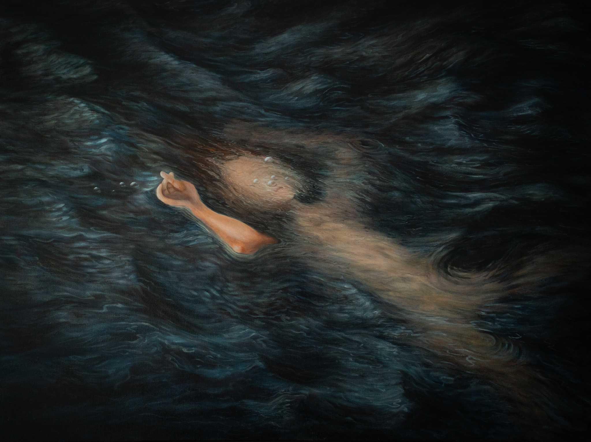 This painting captures the immersive stream of challenges today’s children face as they’ll inherit a world in crisis. It speaks to the urgent realities of (climate) change and the looming threat of drowning (literal and symbolic). A sense of unease flows through the composition, nevertheless there’s also hope, embodied in the subtle gesture of crossed fingers.